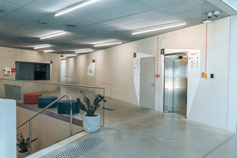 Zdjęcie korytarza przy wejściu głównym do budynku Cogiteonu. W tle winda, schody oraz pomieszczenie ochrony