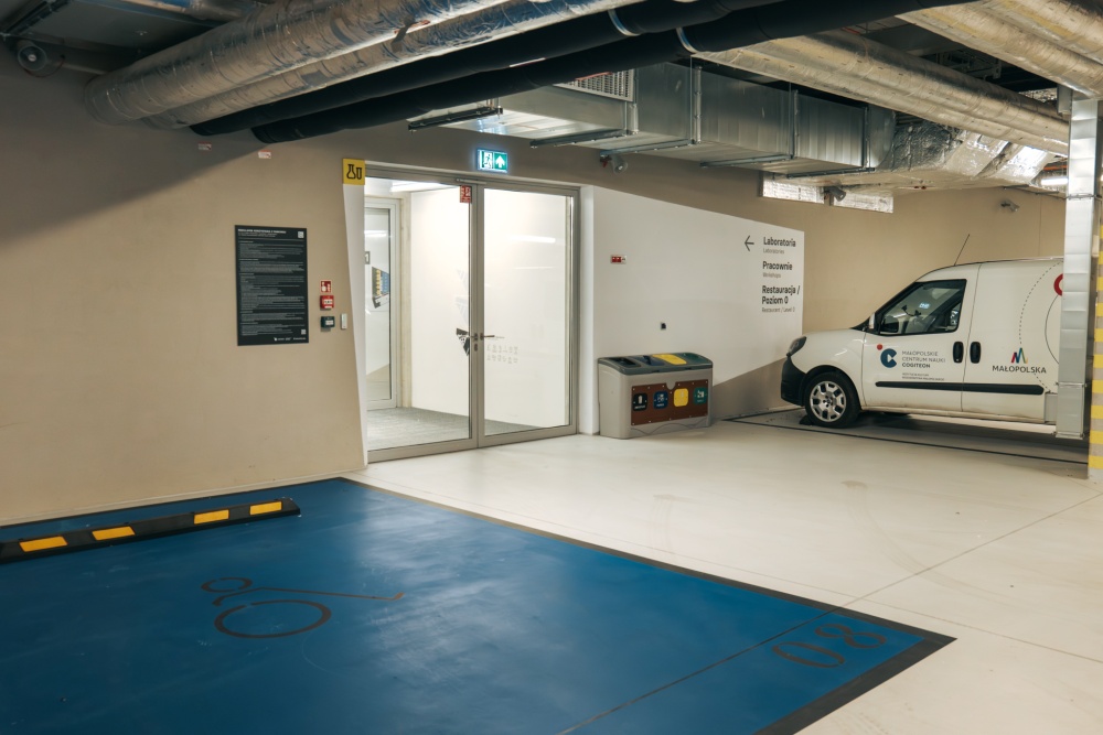 Pod parkingiem naziemnym znajduje się również parking podziemny, na którym znajdują się 4 miejsca parkingowe dla osób z niepełnosprawnościami – zlokalizowane – 2 przy wejściu prowadzącym na wystawę oraz 2 przy wejściu prowadzącym do laboratoriów i pracowni oraz warsztatu. Aby wjechać na parking podziemny, przejeżdżając przez szlaban, należy wjechać na wprost w podziemia parkingu. Na parkingu podziemnym nie można pozostawiać samochodów wyposażonych w instalację gazową (LPG).