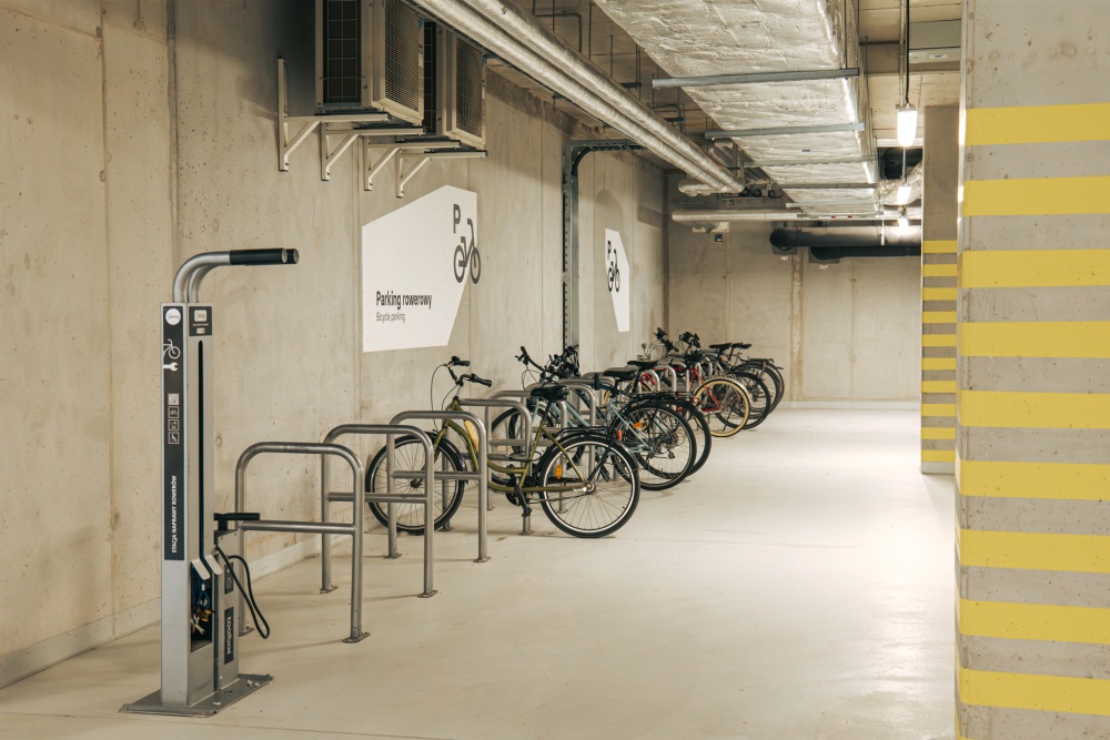 Zdjęcie stojaków rowerowych oraz samoobsługowych stacji naprawy rowerów w parkingu podziemnym Cogiteonu.