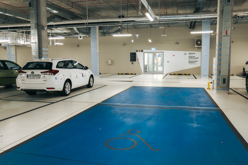 Zdjęcie oznaczonych miejsc parkingowych dla osób z niepełnosprawnościami na parkingu podziemnym Cogiteonu.