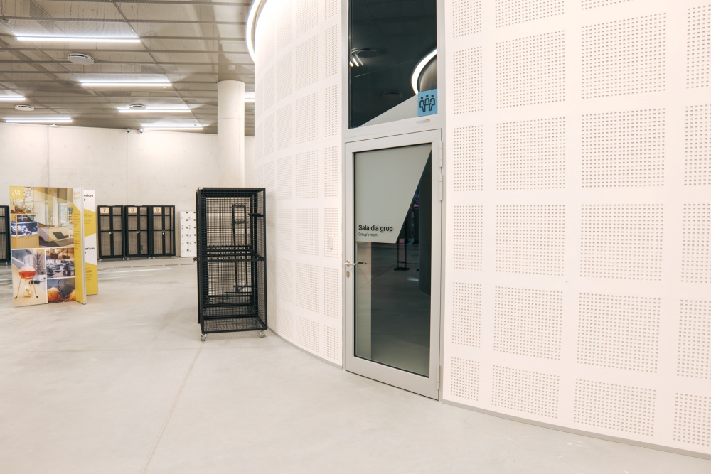 Sala dla grup znajduje się na poziomie -1, na lewo za kasami. Sala dla grup jest dostępna dla osób z niepełnosprawnością ruchową. Do sali prowadzą dwa szerokie wejścia (które znajdują się od strony głównego holu, ale również od strony wystawy).