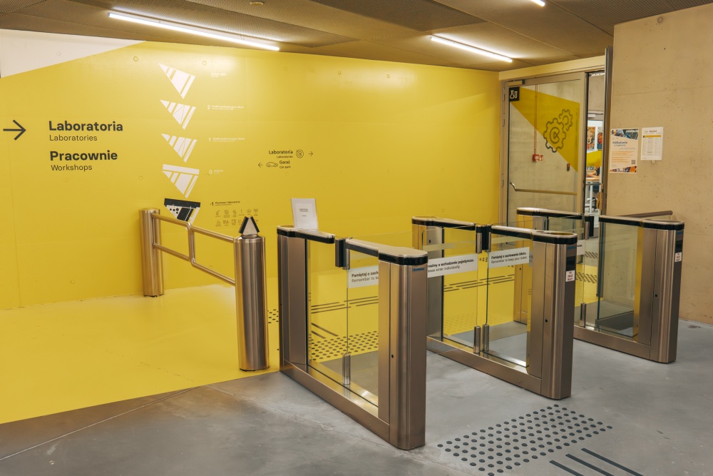 Zdjęcie automatycznych bramek biletowych przy wejściu do strefy laboratoriów i pracowni.