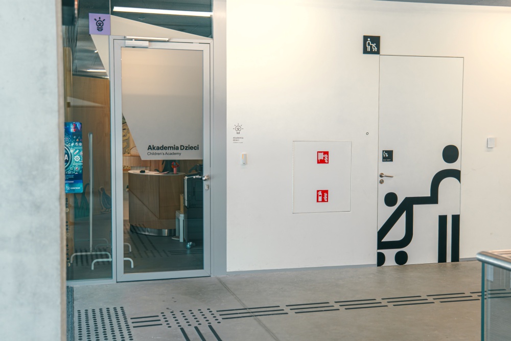 Na każdej kondygnacji budynku zlokalizowane są toalety dostosowane do potrzeb osób z niepełnosprawnościami ruchu (w tym między innymi: za stanowiskiem ochrony na poziomie 0, przy wyjściu z sali wystawy zatytułowanej Co nas łączy? na poziomie -1, przy Pracowni Techniki - w korytarzu na poziomie -1, w korytarzu prowadzącym z i do parkingu podziemnego na poziomie -1, przy Akademii Dzieci i restauracji na poziomie 1).